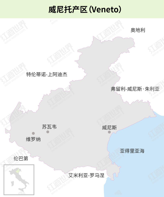 威尼托(Veneto)位于意大利的東北部,以世界知名“水城”——威尼斯(Venice)為首府,坐擁被聯(lián)合國教科文組織(UNESCO)納為世界文化遺產(chǎn)的維羅納(Verona),充滿藝術(shù)和文化的氣息。與此同時,威尼托還是意大利舉足輕重的葡萄酒產(chǎn)區(qū),不僅擁有悠久的釀酒歷史,其獨具一格的釀酒工藝和多樣化的葡萄酒風(fēng)格也令人印象深刻。