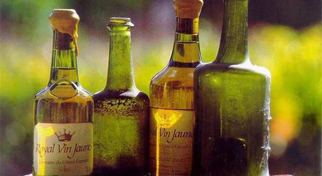 汝拉地區(qū)有生產(chǎn)一種特殊的葡萄酒,被稱為黃酒(Vin Jaune),在國(guó)際上的知名度很高,是汝拉人的驕傲。黃酒的瓶子叫 Clavelin 瓶,瓶身矮胖、結(jié)實(shí)、厚重,容量只有 620ml。黃酒以 100% 的薩瓦涅葡萄為原料,放入老勃艮第橡木桶中發(fā)酵并陳釀 6 年以上,期間不添桶。在木桶陳釀的過程中,酒液表面會(huì)產(chǎn)生一層酵母膜(Blanket/Voile),有點(diǎn)像雪利酒的酒花(Flor)。之所以是 620ml 的容量,據(jù)說這是因?yàn)辄S酒在完成 6 年的陳釀之后,酒液縮減至 62%。