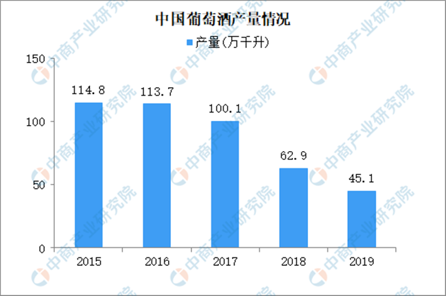 近五年葡萄酒產(chǎn)量接連下滑,2015年葡萄酒產(chǎn)量108.8萬(wàn)千升,2019年跌至45.1萬(wàn)千升,跌幅60.7%。