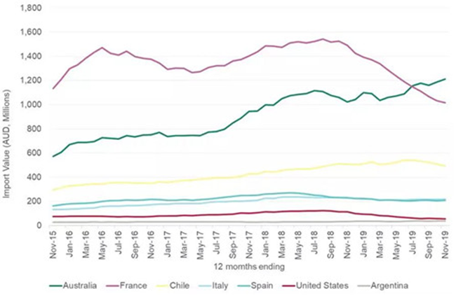 近日,澳大利亞葡萄酒管理局公布了最新出口報(bào)告。截至2019年12月底的12個(gè)月,澳大利亞葡萄酒對中國市場的出口總額及平均出口額雙雙創(chuàng)下年度新高。