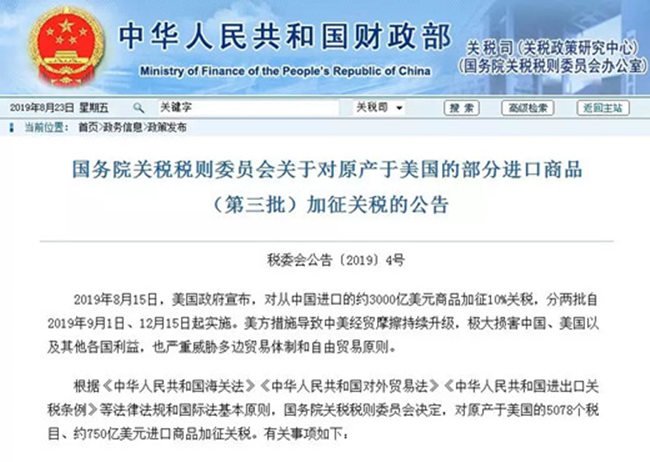 公告顯示:2019年8月15日,美國政府宣布,對從中國進口的約3000億美元商品加征10%關稅,分兩批自2019年9月1日、12月15日起實施。美方措施導致中美經貿摩擦持續升級,極大損害中國、美國以及其他各國利益,也嚴重威脅多邊貿易體制和自由貿易原則。
