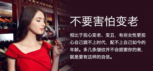 七、不要害怕變老:時間會改變容顏,葡萄酒也會隨著時間的流逝而改變其本身瑰麗的色澤。每一位女性就像一瓶瓶具有陳年價值的紅酒,在最初釀制的酸澀,如女性青春年少的清新自然;而后陳年到最佳適飲年份,這時候的紅酒就像到了最具女性魅力的黃金年華,端莊優雅;再隨后這瓶葡萄酒陳年變成了老酒,這時候的葡萄酒雖然過了最佳適飲年份,風味卻更加的復雜,不少紅酒愛好者都不遺余力的追逐這些陳年老酒。而這時候的女性因為時間、閱歷的沉淀,沒有了青澀,卻更加大氣,貴氣自生。